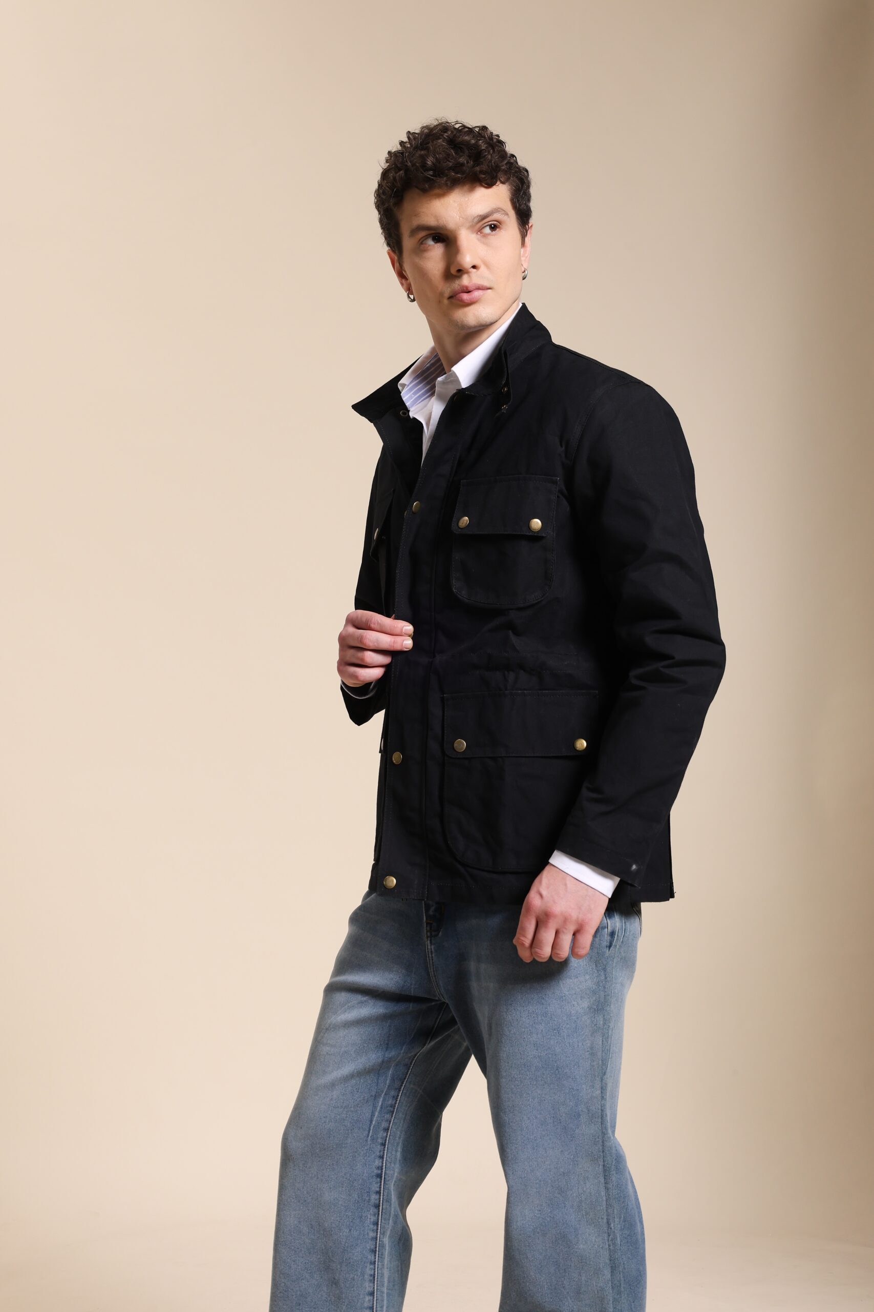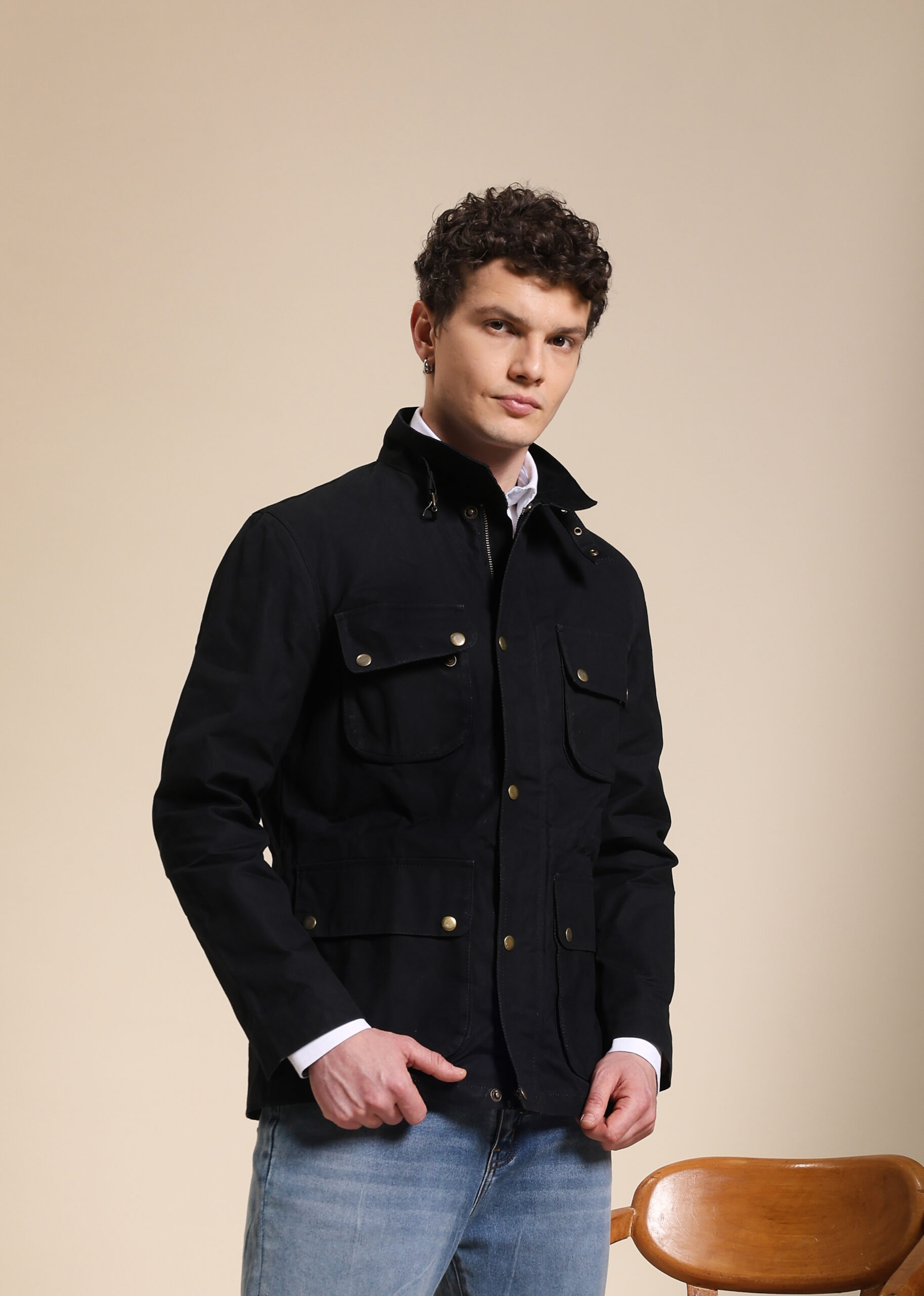 Black waxed jacket with four pockets.