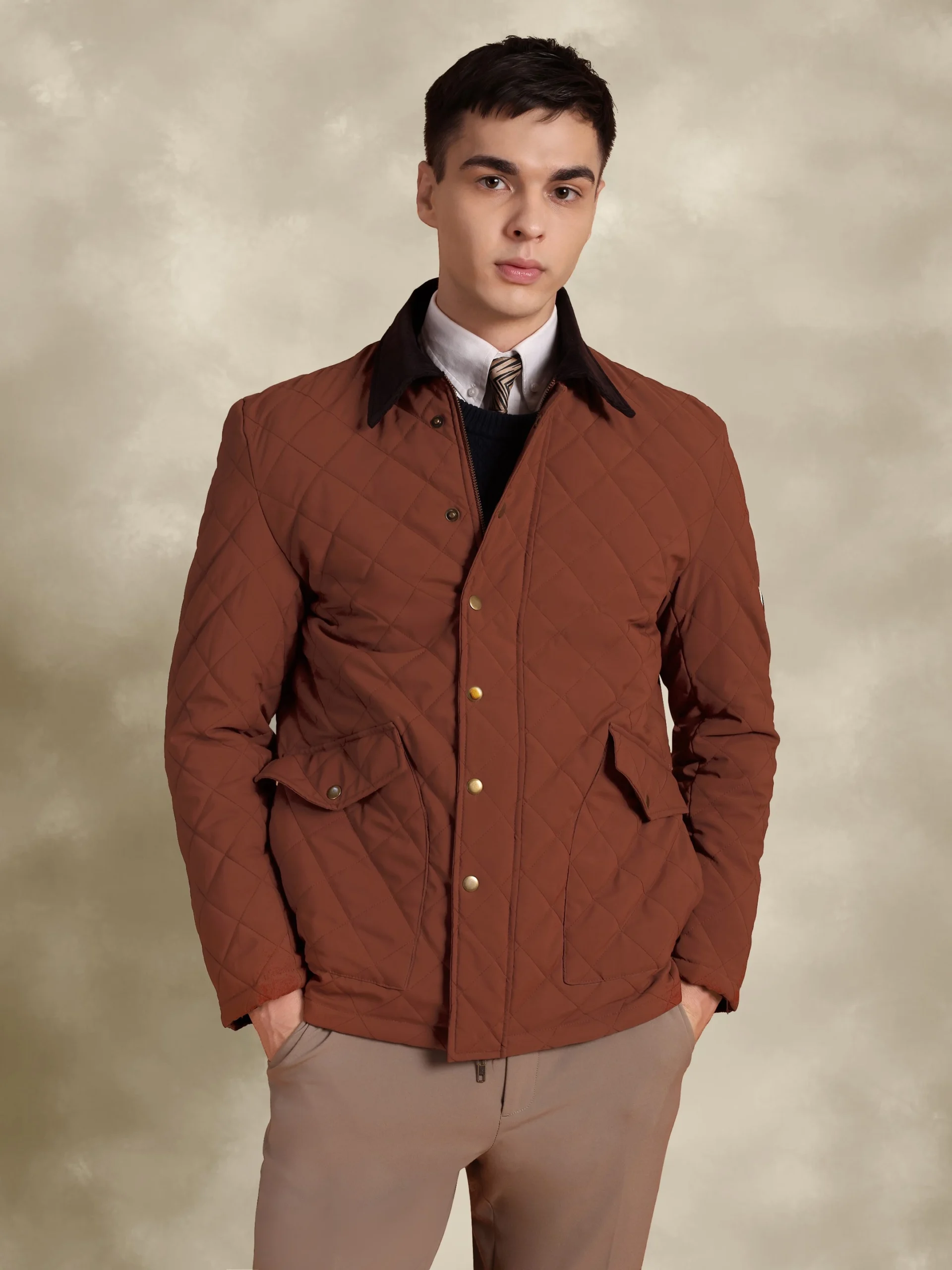Tagore Jacket- Safari Rust Slim Fit Quilted Jacket With Corduroy Collars